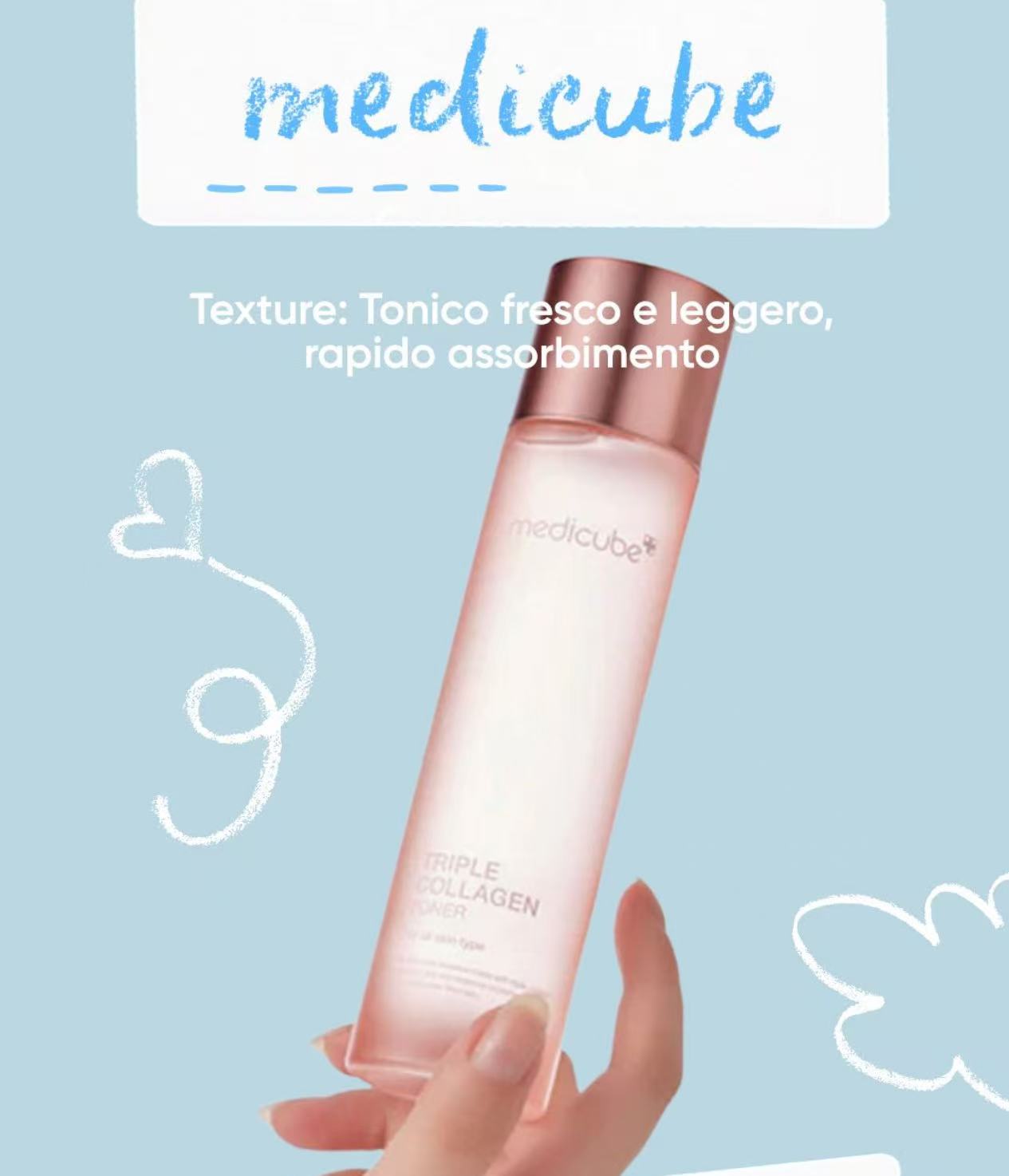1️⃣ Dopo la detersione, applica una piccola quantità di Medicube Triple Collagen Toner 4.0 direttamente con le mani o con un dischetto di cotone.